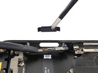 Insert one tine of a pair of pointed tweezers into a divot on a tab in the top right corner of the display cable shield.