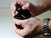 Pry off the mouse feet located at the front and back of the underside of the mouse by wedging a flat head screw driver into the depressed groove and applying upward force.